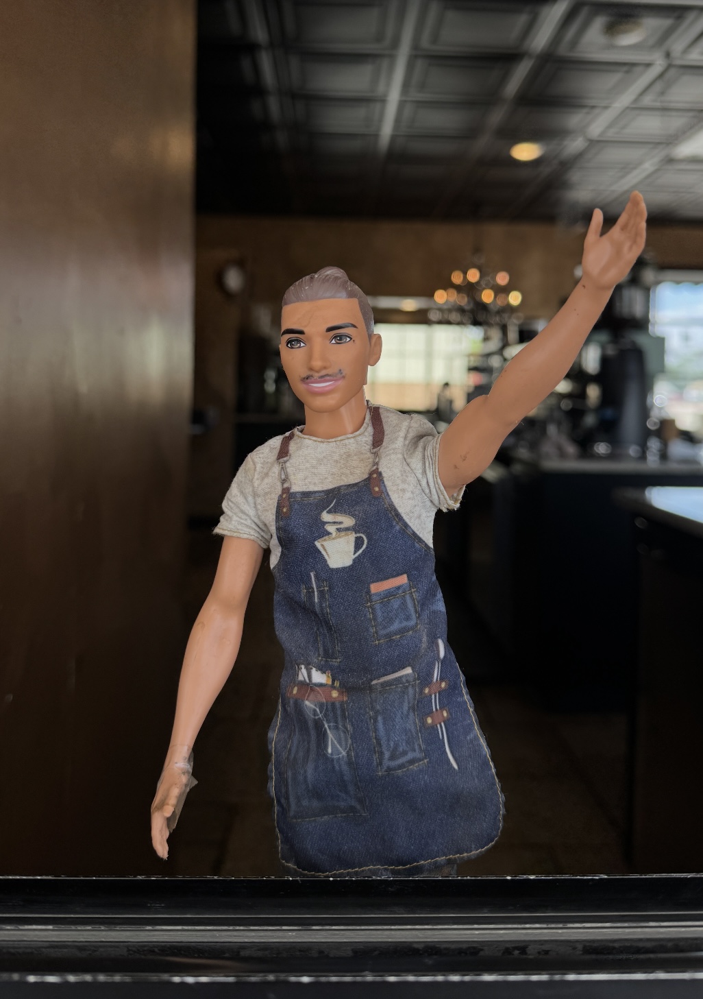 Meet Barista Ken! Ken parachuted in with a coffee filter one day long ago and proved to be a hard worker behind the bar. His humble days slinging ‘spro are behind him now, though. After what Ken refers to as his “Muffin Sabbatical” (he got trapped in the pastry case for two months) he was promoted to Senior Vibe Curator. With his 2.5 denim pockets and 0 functional limbs, Ken never fails to serve up a warm plastic smile for every customer that comes into our south store. His hobbies include looking good near accent lighting, climbing into places he shouldn’t be, and reminding everyone that he had a man bun before it was cool. If you see Ken around, don’t be afraid to say hi! He’s sure to wave back – his hand is almost always stuck in that position.